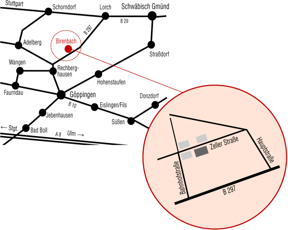 Von Lorch/Wäschenbeuren kommend auf der Bundesstraße B297 die zweitmögliche nach rechts abbiegen - Hauptstraße. Die nächstmögliche links abbiegen - Zeller Straße. Ca. 200m dem Straßenverlauf folgen, dann auf der linken Seite (ehemalige Volksbank-Filiale).